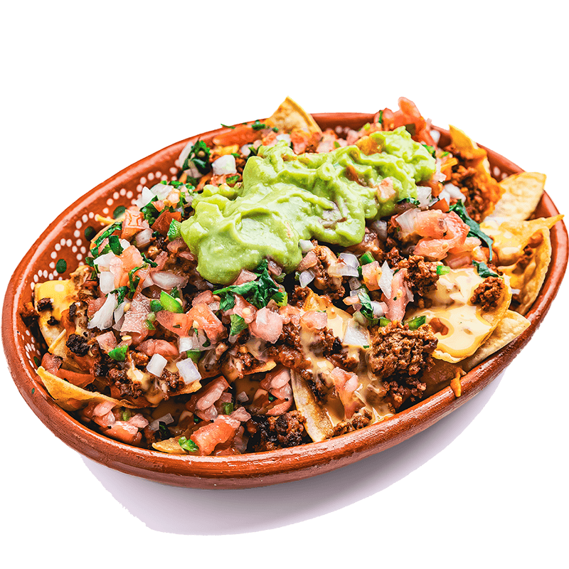 Tortilla chips, beans, choice of meat nacho cheese sauce, pico de gallo and guacamole.