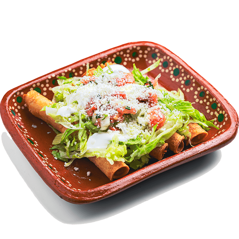 4 crispy rolled up tacos filled with chicken lettuce, pico de gallo, sour cream and cotija cheese.