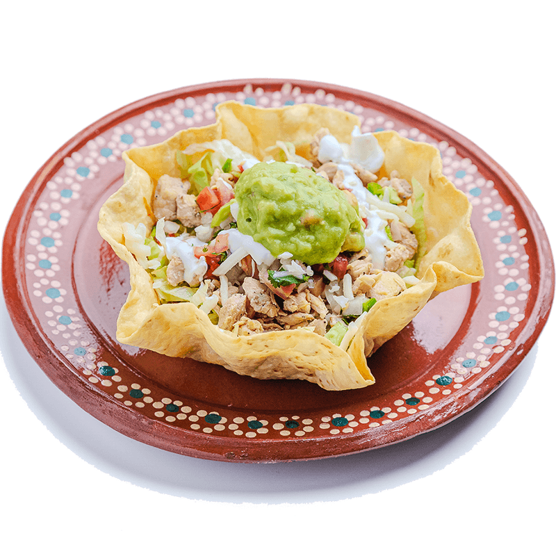 Fried flour tortilla bowl, beans, lettuce, choice of meat, pico de gallo mozzarella cheese, sour cream and guacamole.