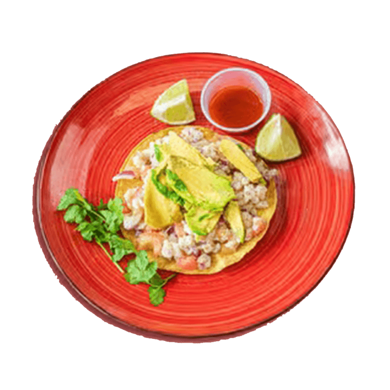 Crispy tostada, tender pieces of fish marinated in lemon juice with onion tomatoes, cucumber with avocado slices.